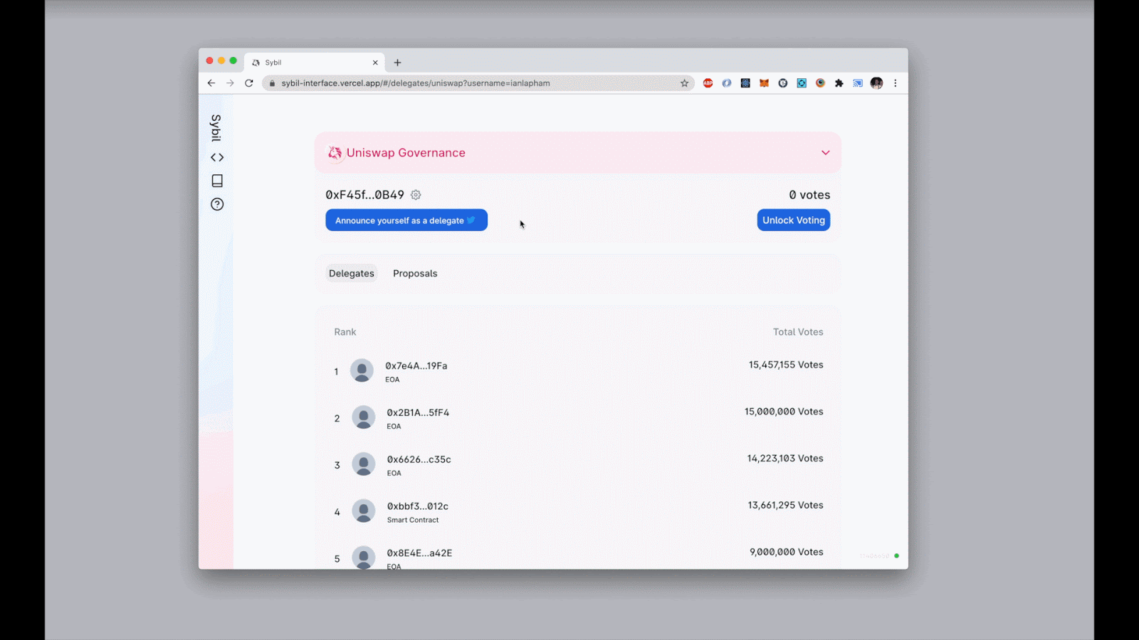 Today we’re excited to introduce Sybil, a governance tool for discovering delegates. Sybil maps on-chain addresses to digital identities to maintain a list of delegates, all while avoiding pesky user signups, on-chain transactions, and manual record keeping.