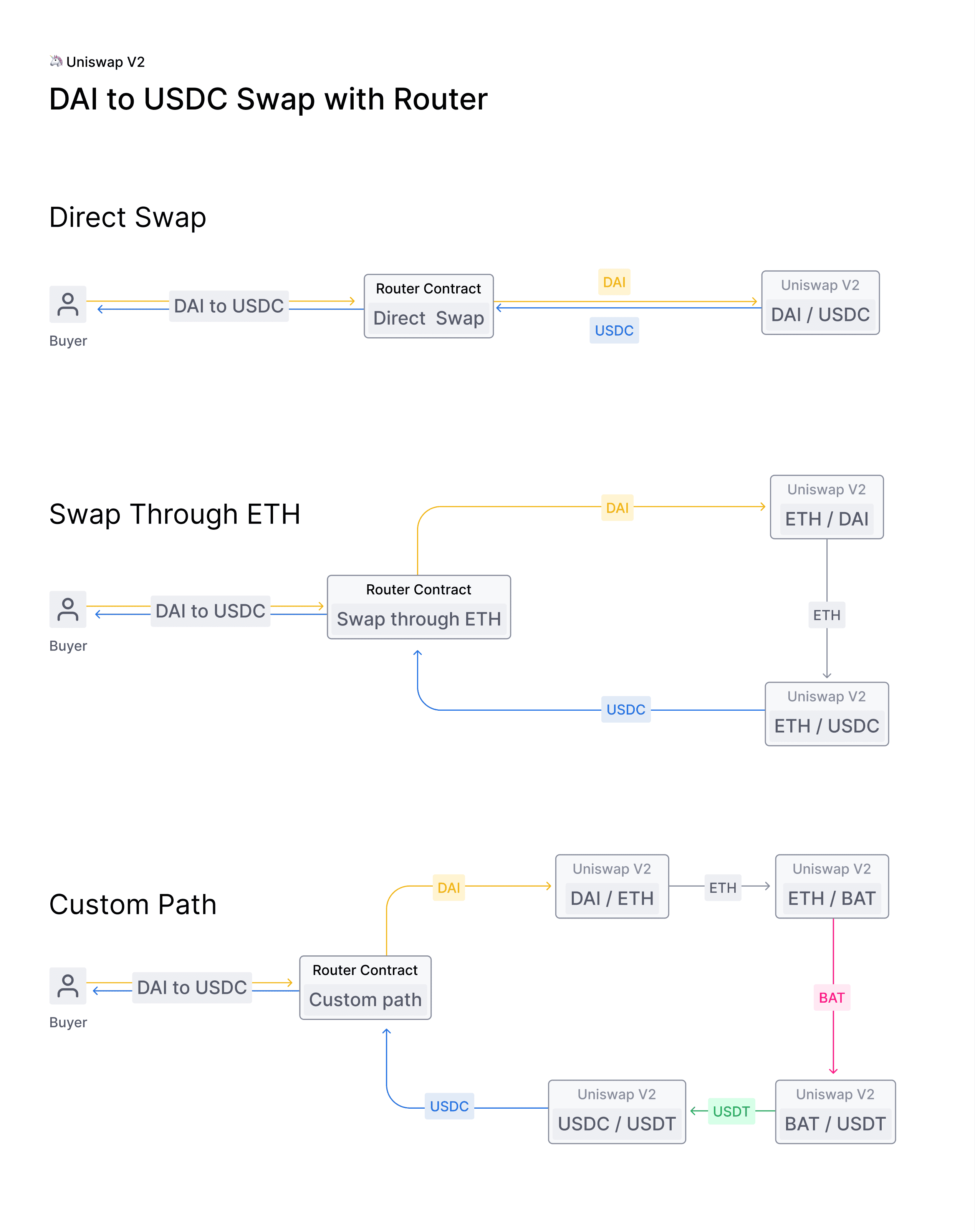 For additional details please read the architecture section of the in-progress Uniswap V2 docs or the core and periphery smart contracts themselves.
