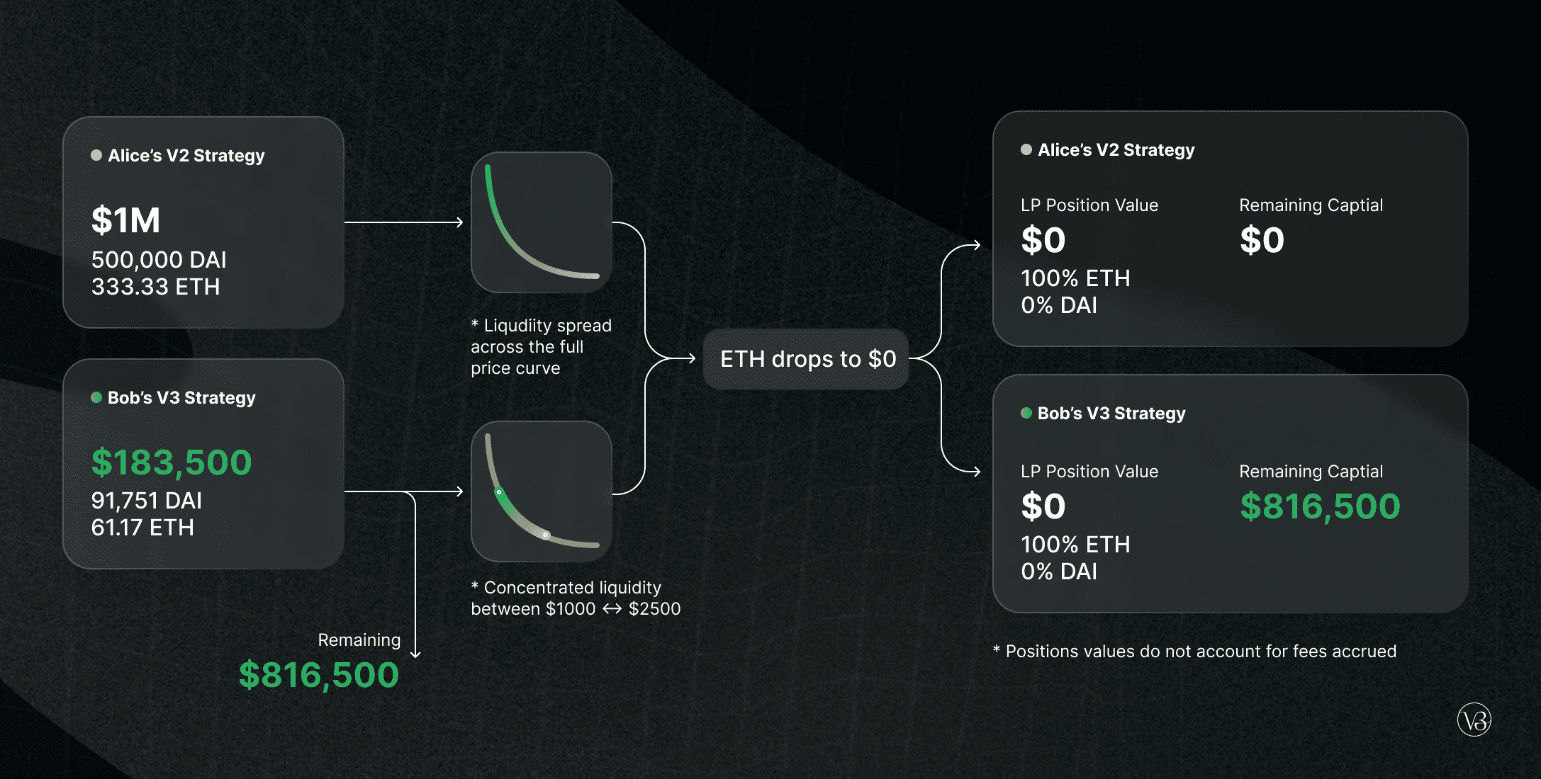 Bob’s custom position also acts as a kind of stop-loss for his liquidity. Both Alice and Bob’s liquidity will be entirely denominated in ETH if the price of ETH falls to $0. However, Bob will have lost just $159,000, versus Alice’s $1m. Bob can use his additional $816,500 to hedge against downside exposure or to invest in any other conceivable strategy.