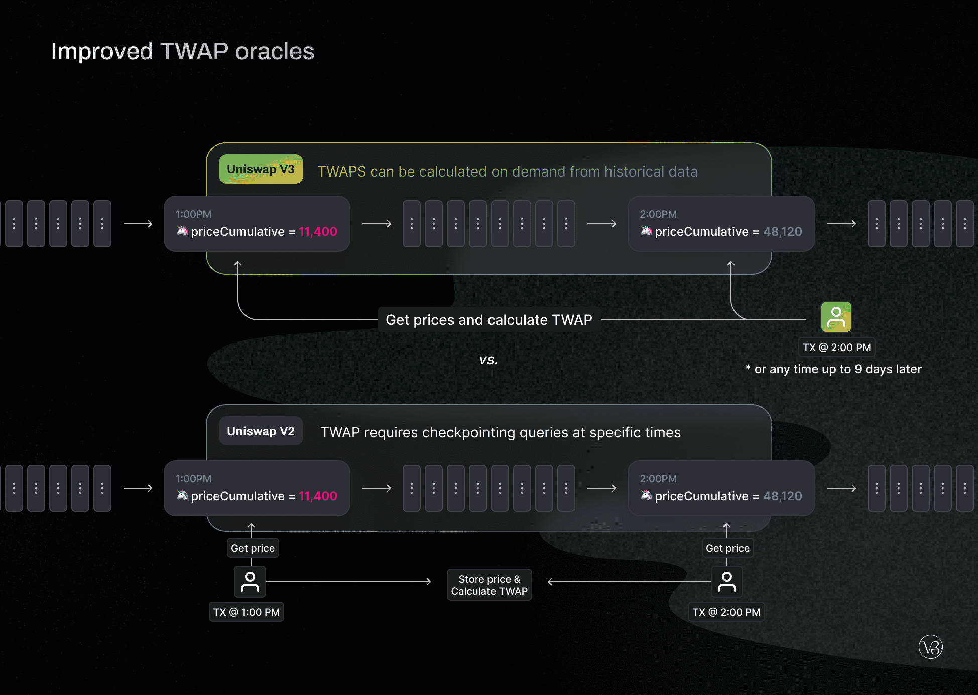Uniswap v3 offers significant improvements to the TWAP oracle, making it possible to calculate any recent TWAP within the past ~9 days in a single on-chain call. This is achieved by storing an array of cumulative sums instead of just one.
