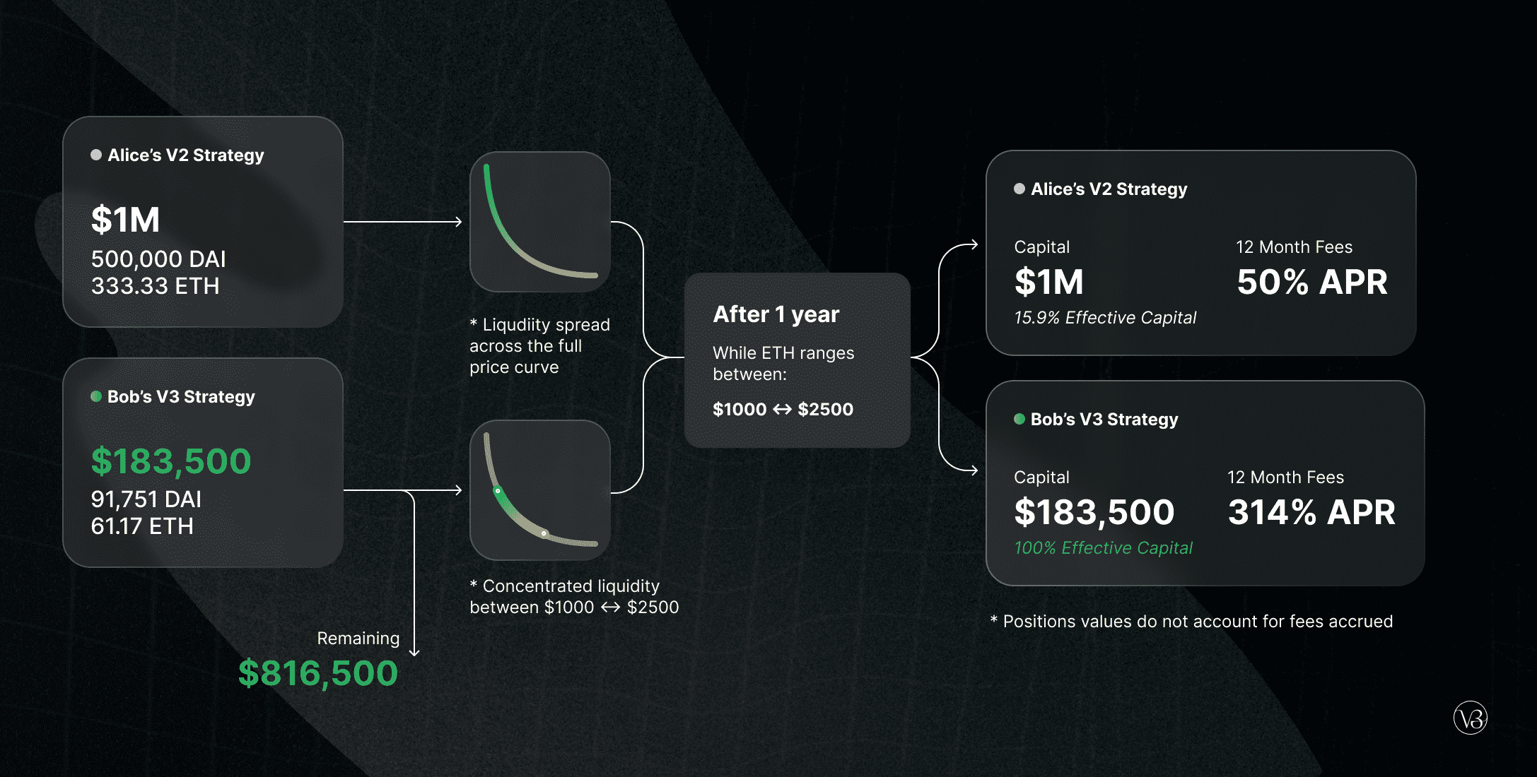 By concentrating their liquidity, LPs can provide the same liquidity depth as v2 within specified price ranges while putting far less capital at risk. The capital saved can be held externally, invested in different assets, deposited elsewhere in DeFi, or used to increase exposure within the specified price range to earn more trading fees.