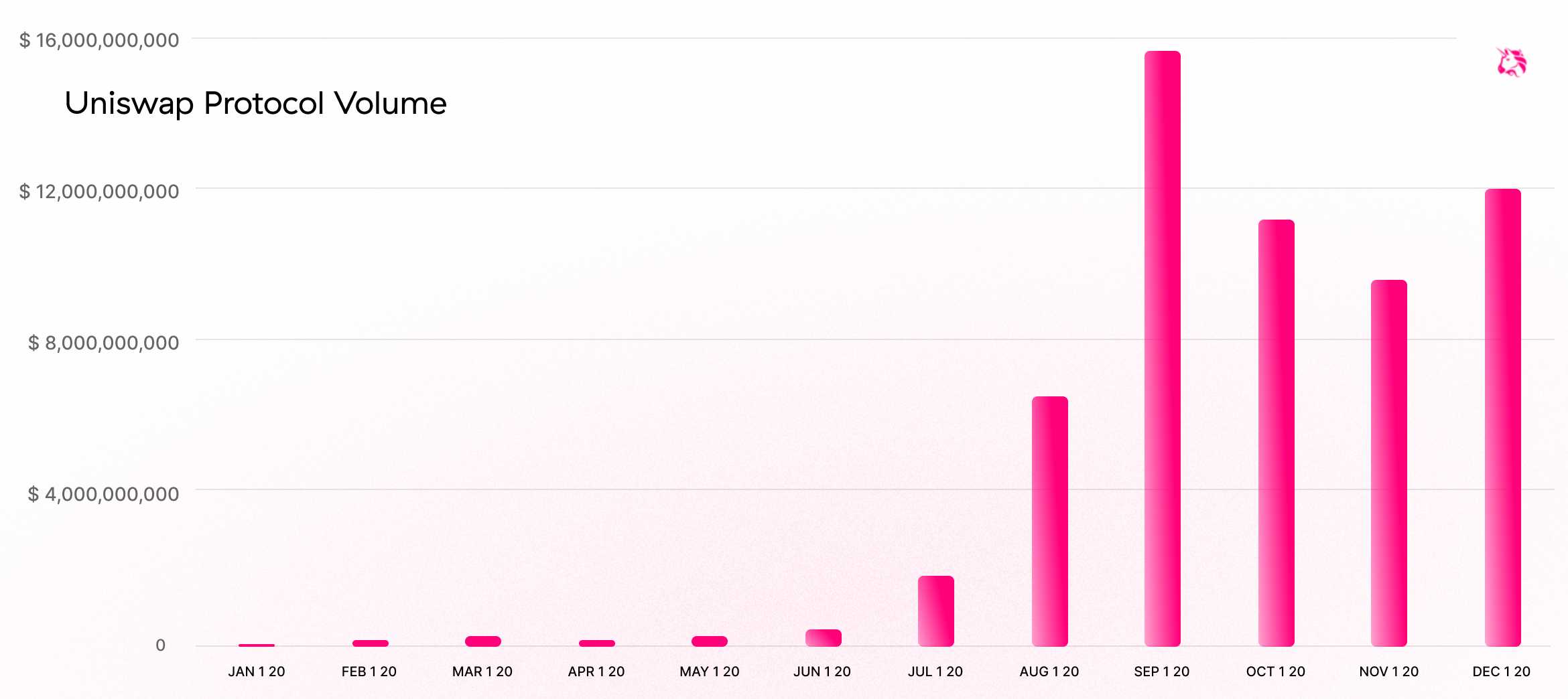 2020 was a breakout year for the Uniswap protocol. As it comes to a close, we wanted to review some key accomplishments from the past 12 months and share some insight into our roadmap for the coming year.