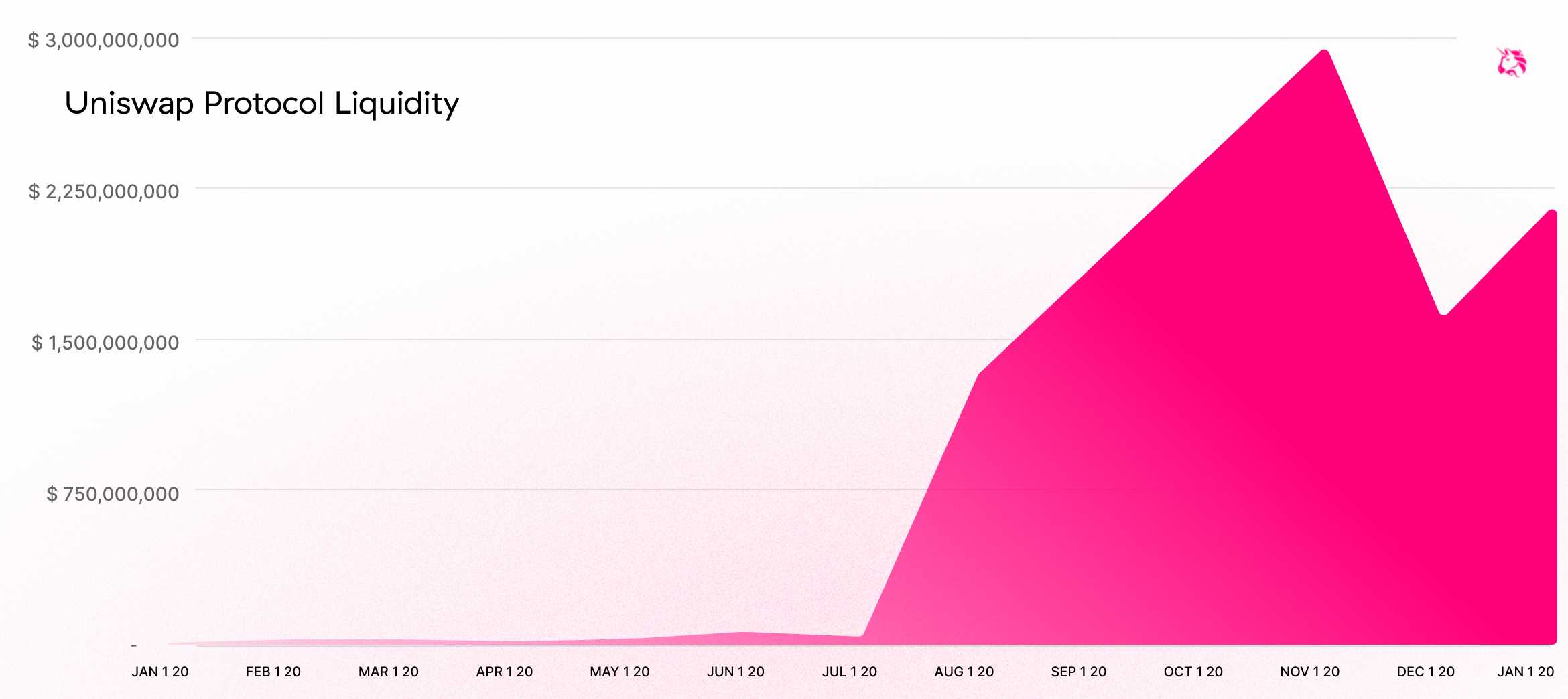 The Uniswap protocol currently commands over $2bn in liquidity, up 17,000% from $12m at the start of the year.